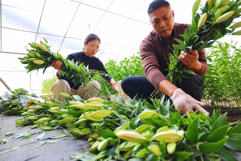 寒冬時節,崗埠農場高效農業示范園11號大棚內一片春意盎然。一株株百合花挺拔站立,不少花苞已露出粉色,在綠葉的襯托下格外嬌艷動人。去年,崗埠農場高效農業示范園大力發展鮮切花產業,引進了“中國紅”“索蚌”等百合花品種,共種植14萬株。通過為周邊種植戶提供技術指導,農場帶動大家發展鮮切花產業。圖為工作人員正在整理百合鮮切花。